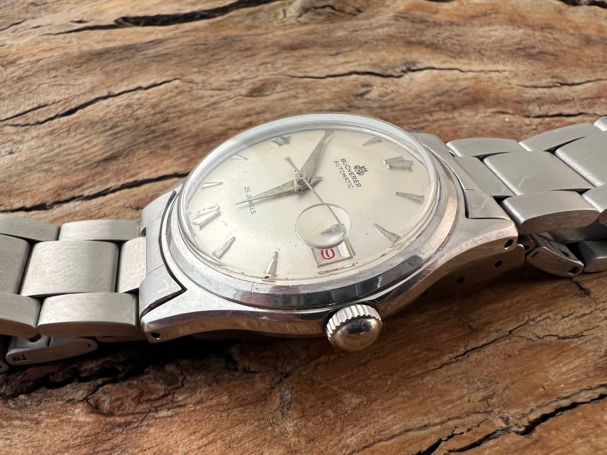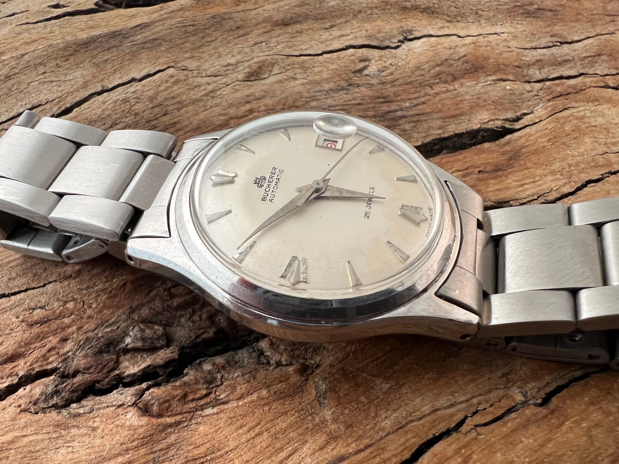 Dial Perfect silver pie pan shaped dial with Bucherer Automatic in black under the Bucherer logo.  Date aperture window (red on white) at 3 o'clock. Marked 25 Jewels in black at bottom of dial. Pendant and double pendant hour markers in silver.  Silver hour and minute hands and silver sweep second hand.