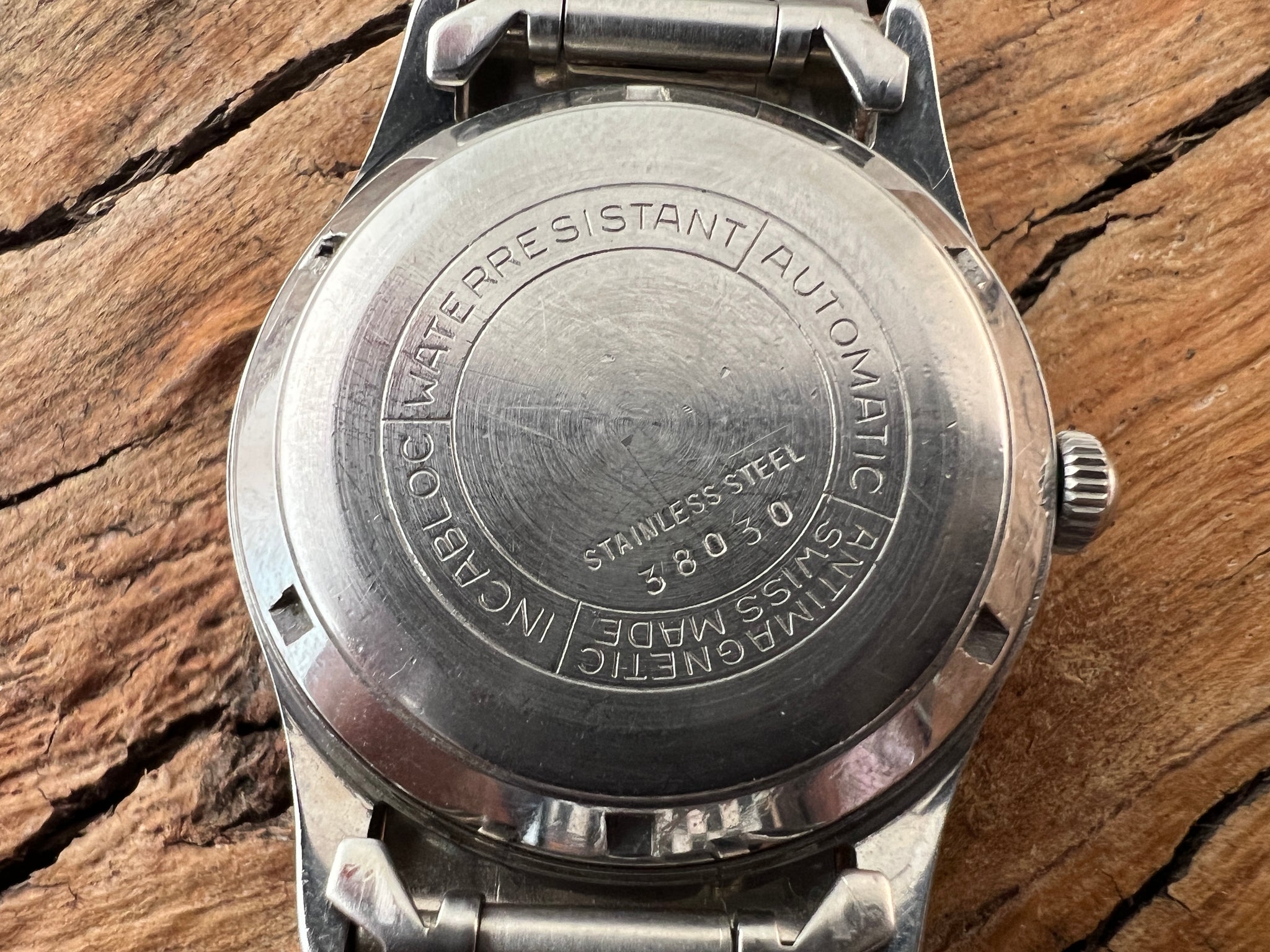 Case Hefty stainless steel case marked "Incabloc, Waterproof, Automatic" on back with serial 38030.