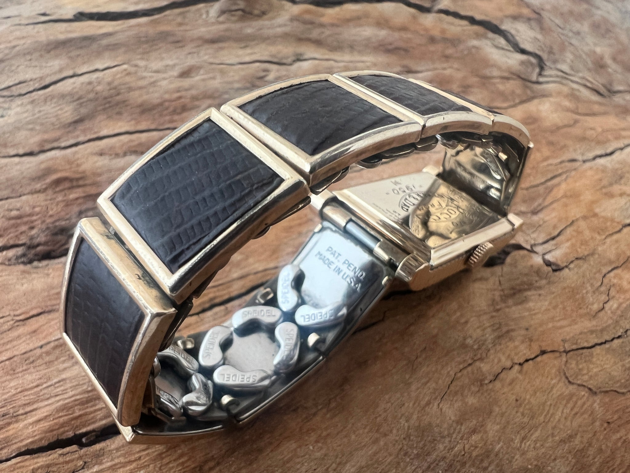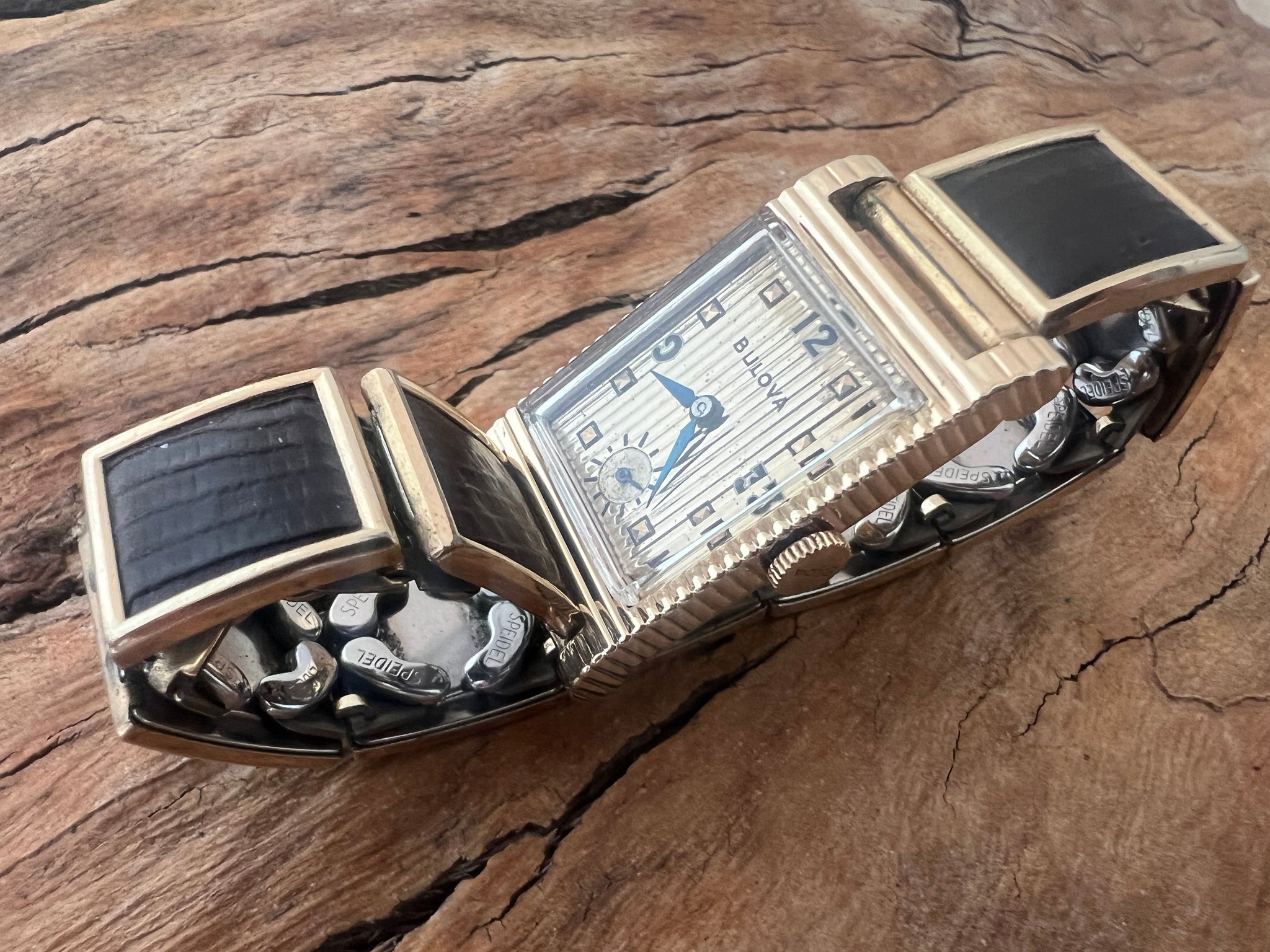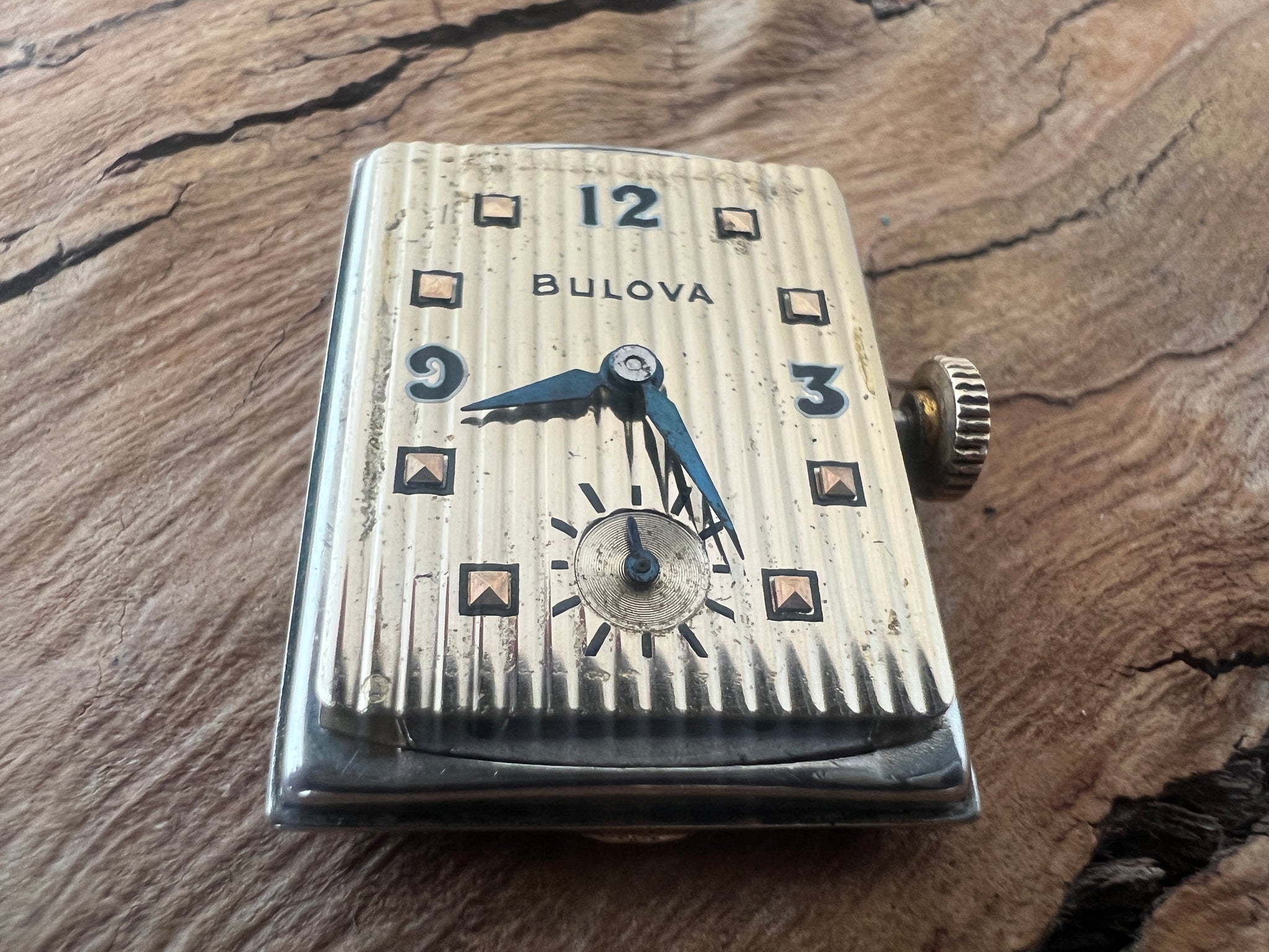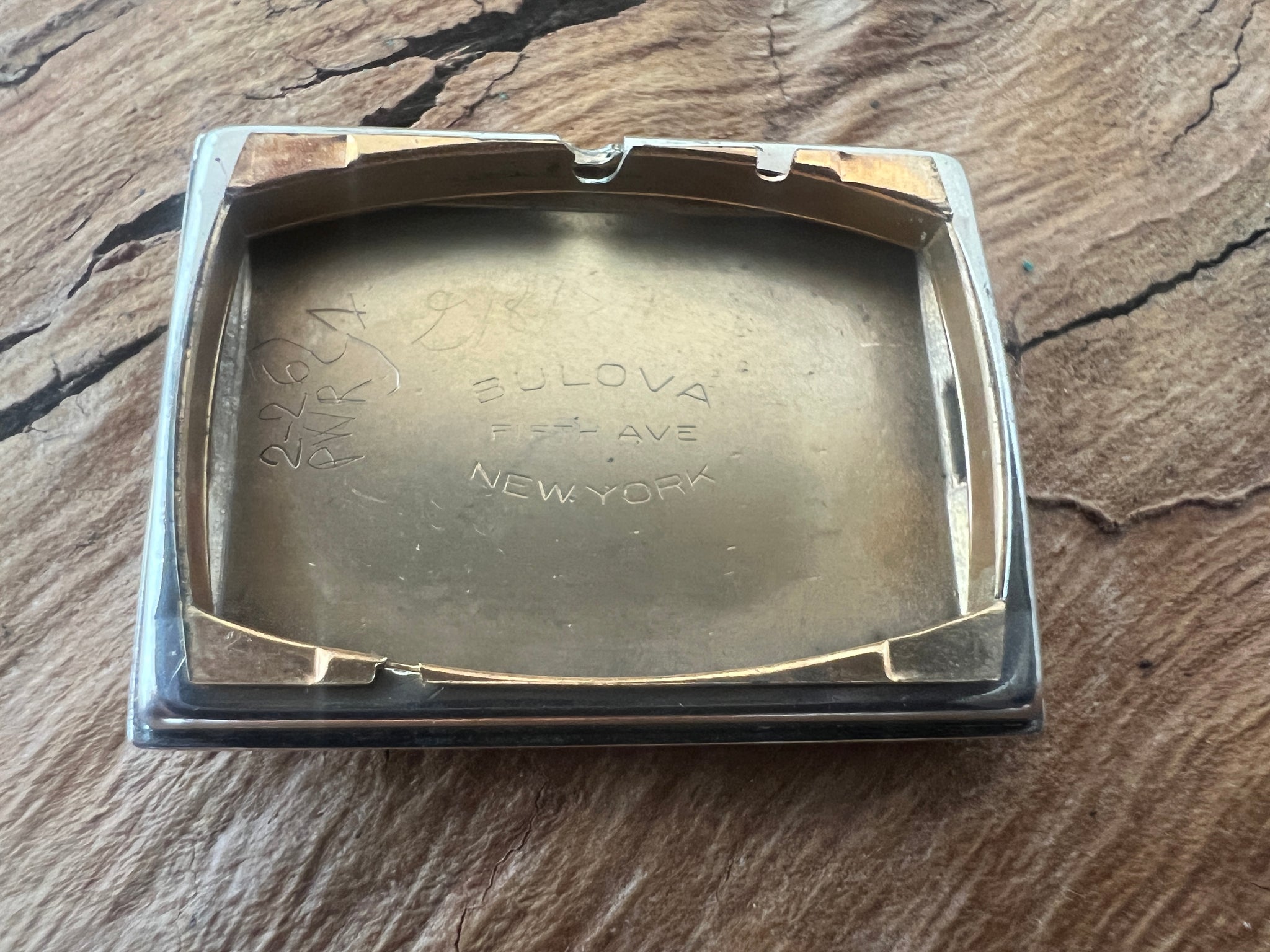 Case Gold plated rectangular case with horizontal ribs that continues the dial design. Cool engraving that reads "To Rocco From Mother and Dad, 1950". Inside of back lid signed "Bulova, Fifth Ave, New York"