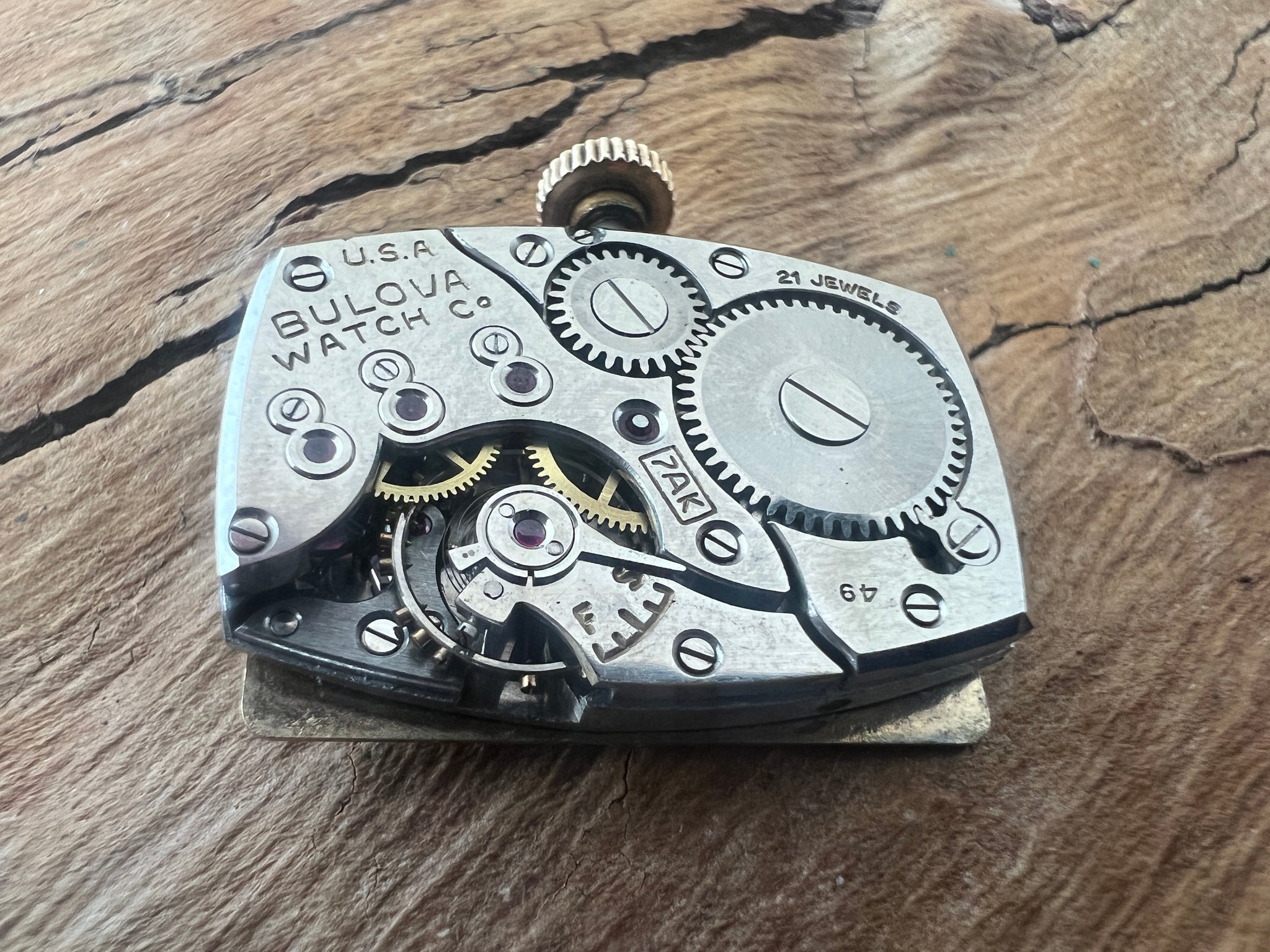 Fitted with a 21 jewel Cal 7AK Bulova manual wind movement that has recently been serviced by us and comes with a 12-month mechanical warranty.