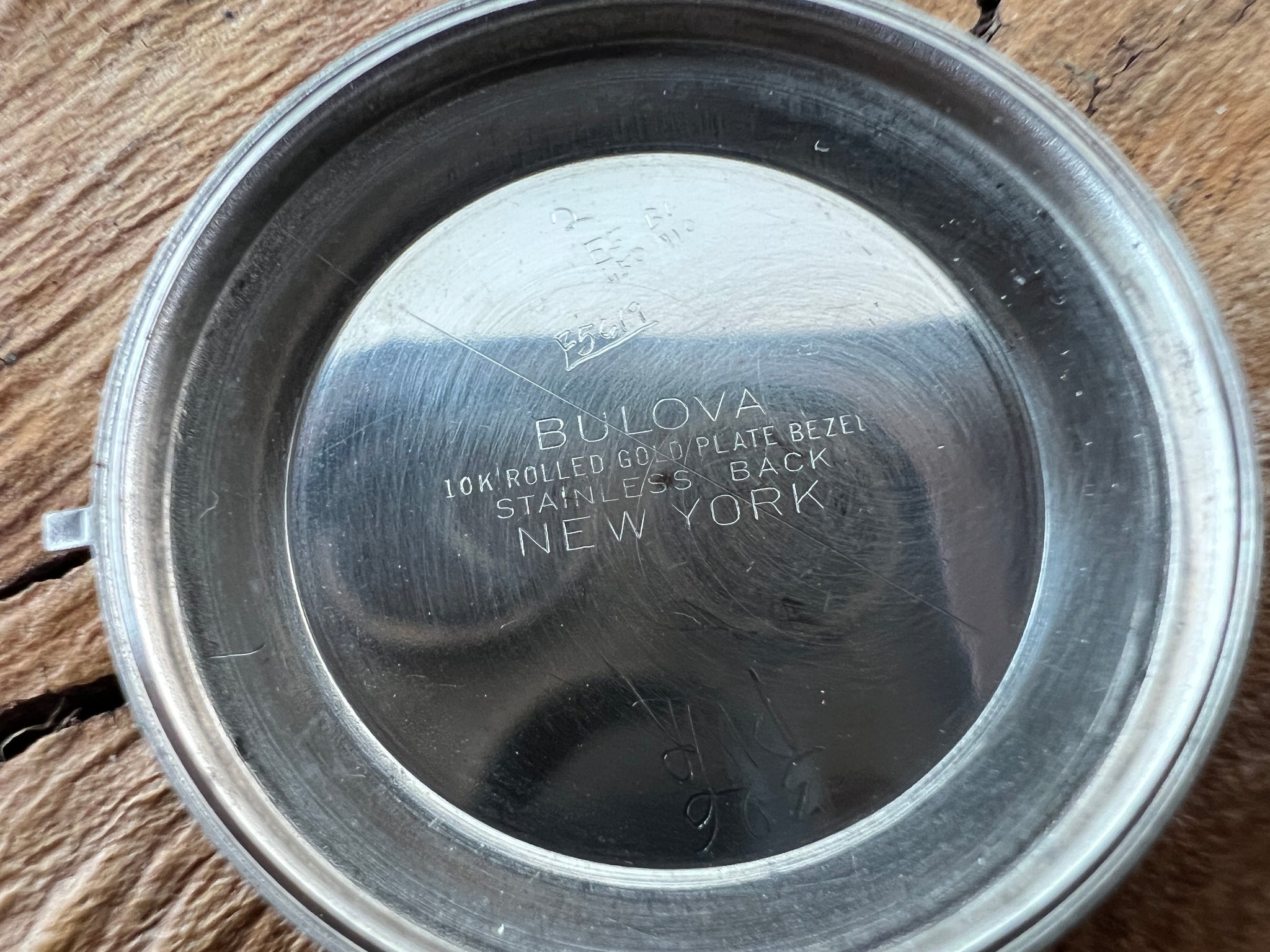 Case 10K rolled gold pate bezl with stainless steel back lid with screw down ring. Back signed Bulova with date code L5 (1955) and serial A813604. Inside lid signed Bulova, New York