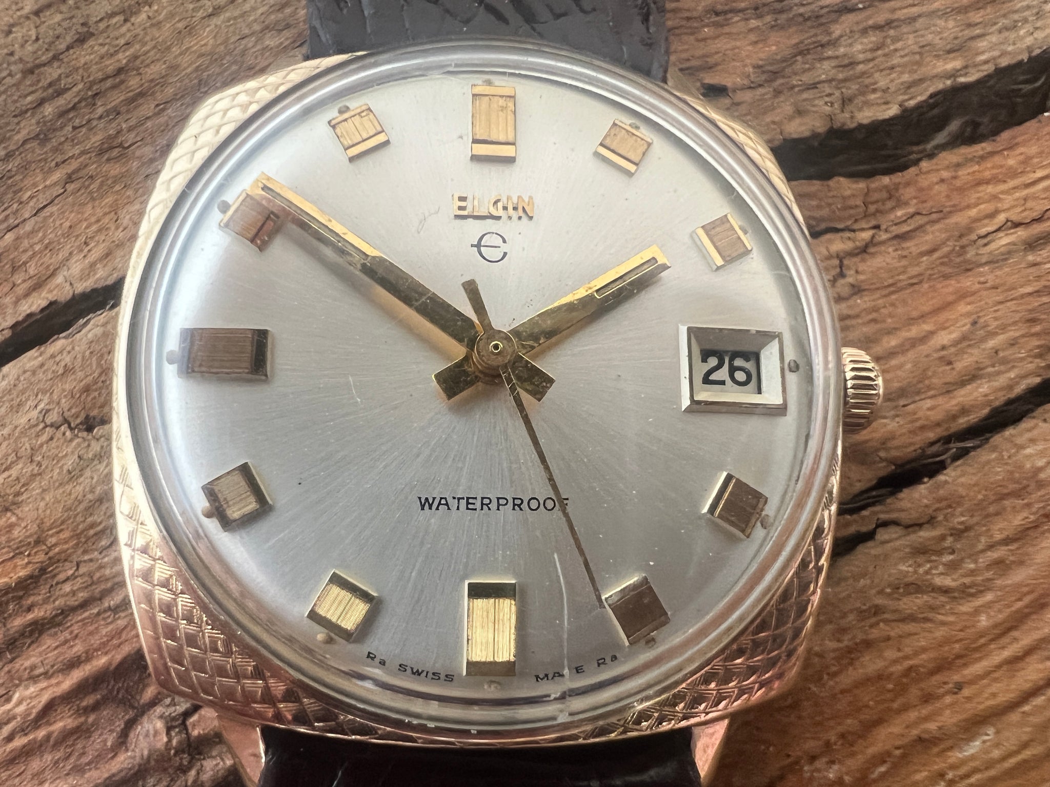 Dial Perfect silver dial with square and rectangular hour markers, squared off hour and minute hands and a gold sweep second hand.  Date aperture window, trimmed in gold, at 3 o'clock. Elgin marked in gold at top with the Elgin logo below and 'Waterproof' in black at bottom. Note:  I noticed crack in crystal, so will replace that.