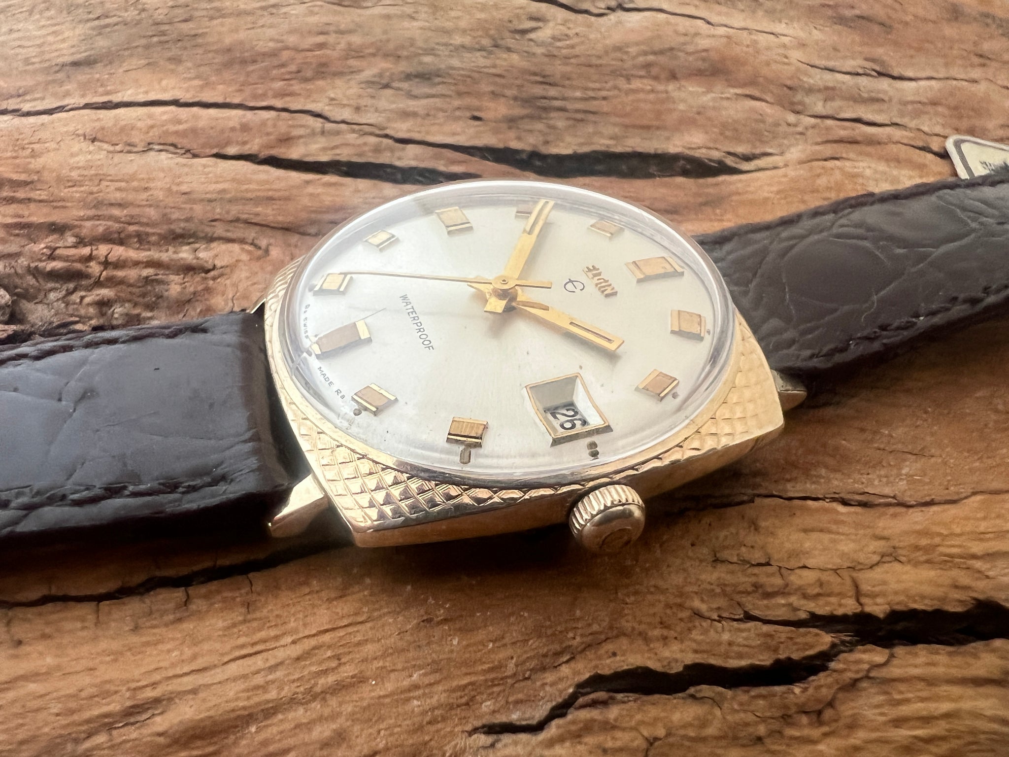 Case 10K rolled gold plated bezel and case with a fantastic hobnail textured design around bezel front. Back is engraved "Allen Jones, 12-25-68".  A Christmas gift at the height of the Hippie Revolution