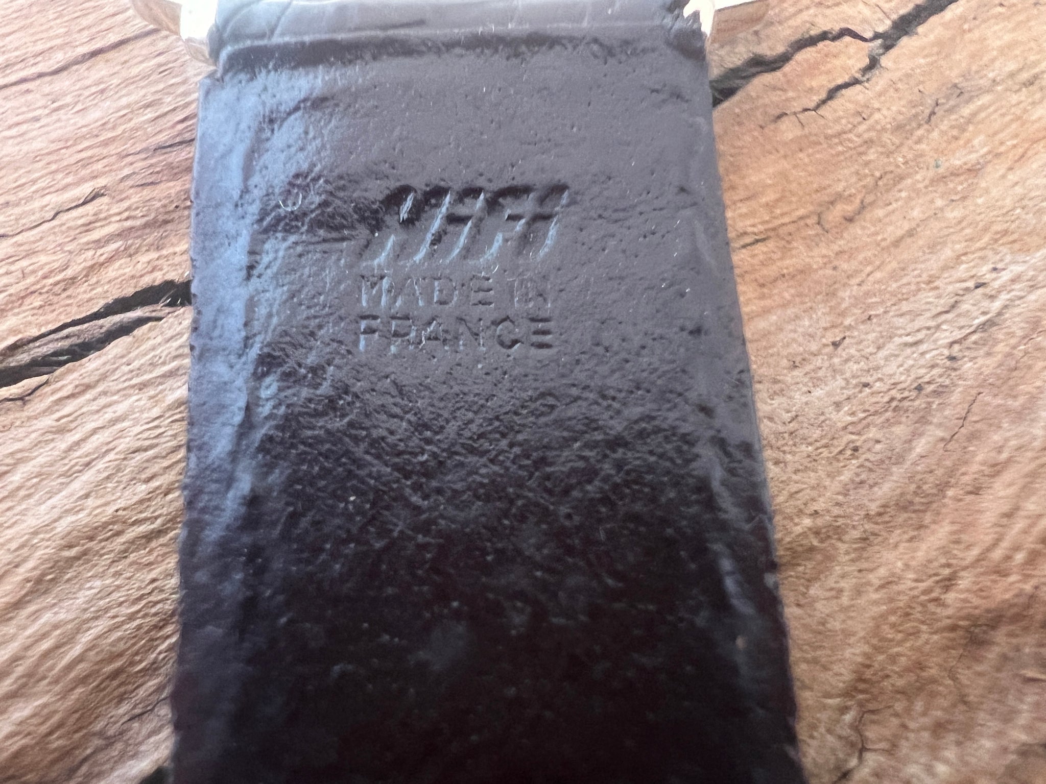 Strap Fitted with a black French leather strap (18mm) with golden buckle