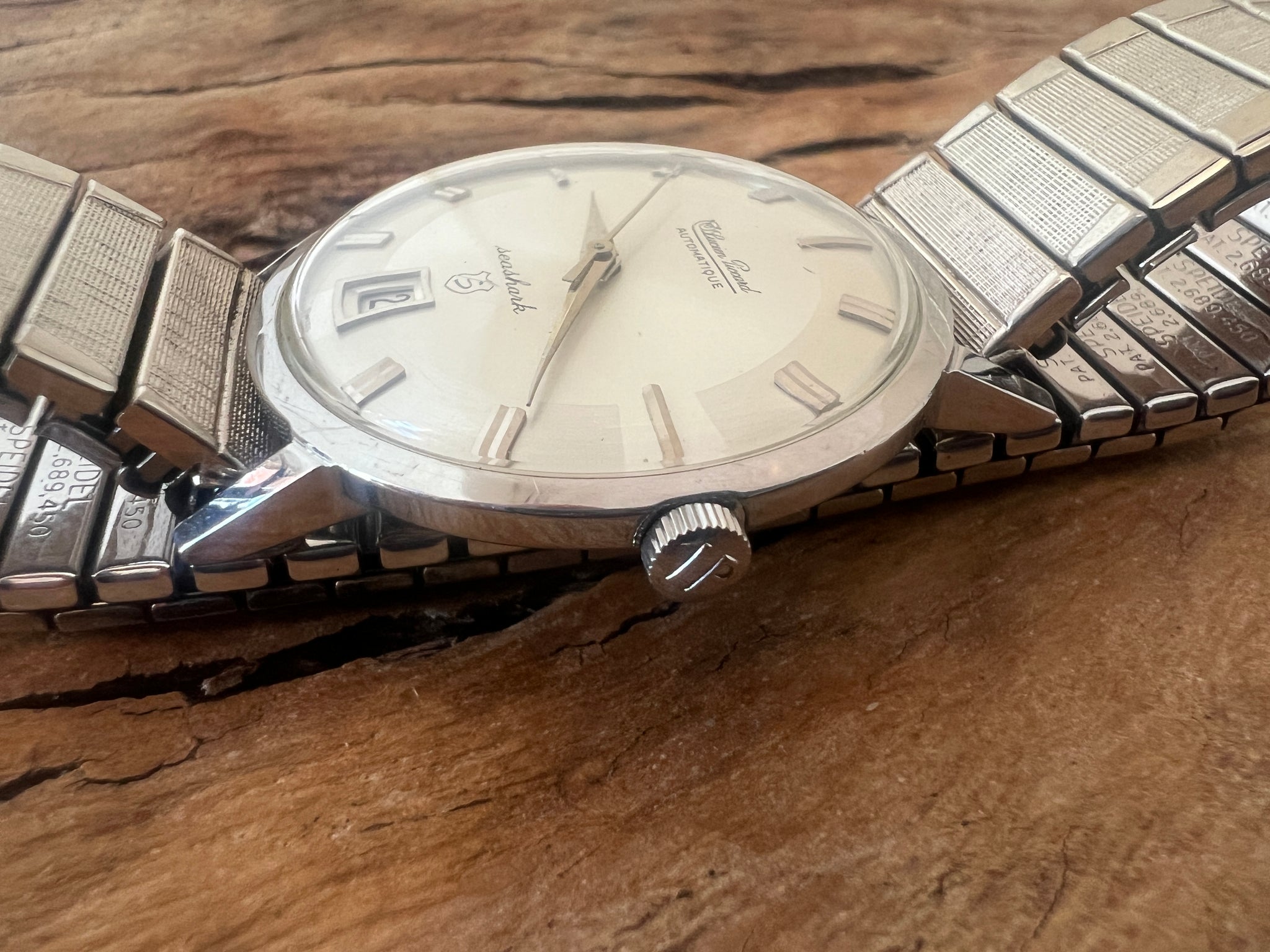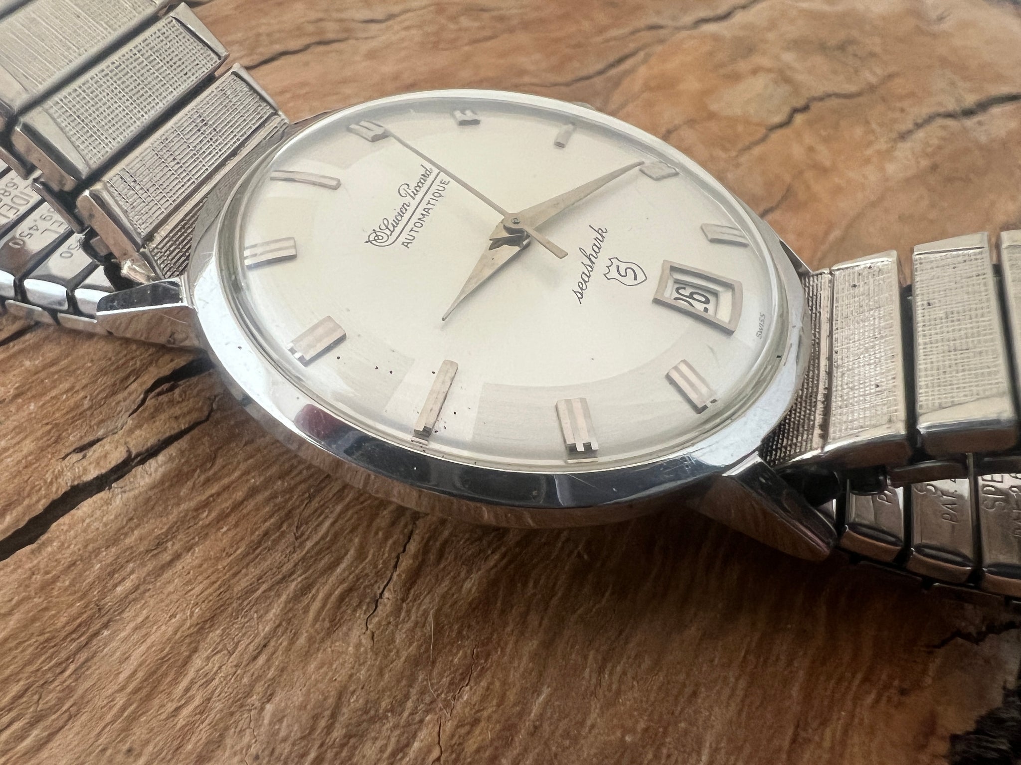 | Dial | Perfect two-tone silver dial with a more matte silver on the inside. Signed Lucien Piccard at top and "Automatique" with "Seashark" at bottom. Single and double silver bar markers for the hours and date aperture window, trimmed in silver, at 3 o'clock |