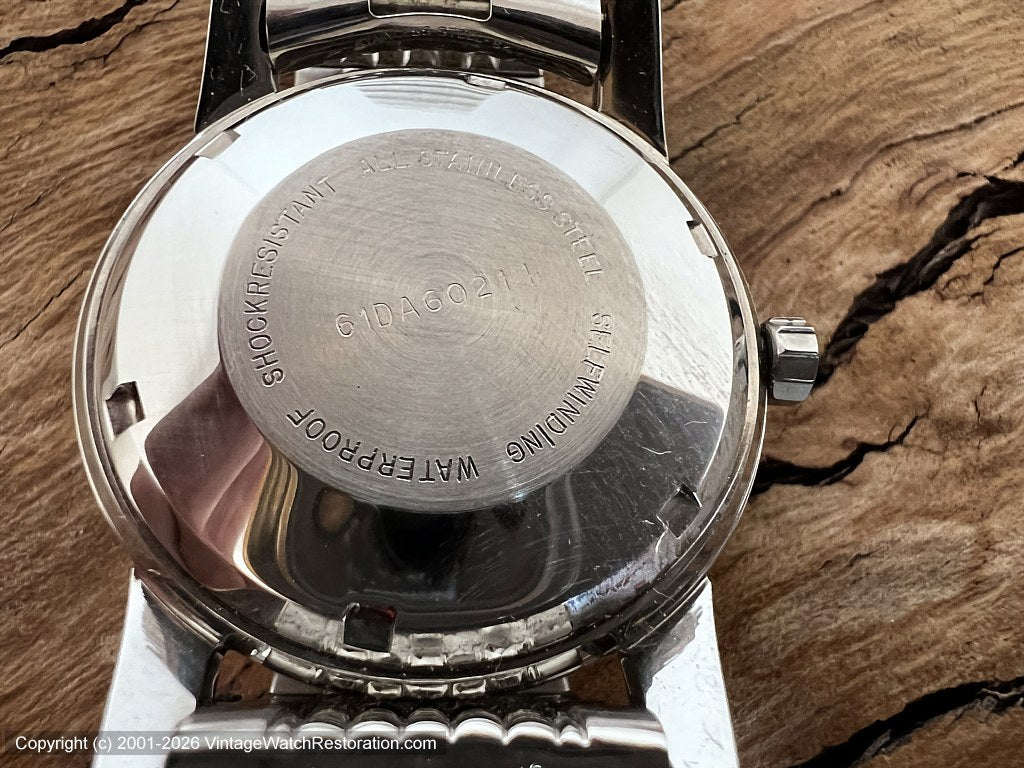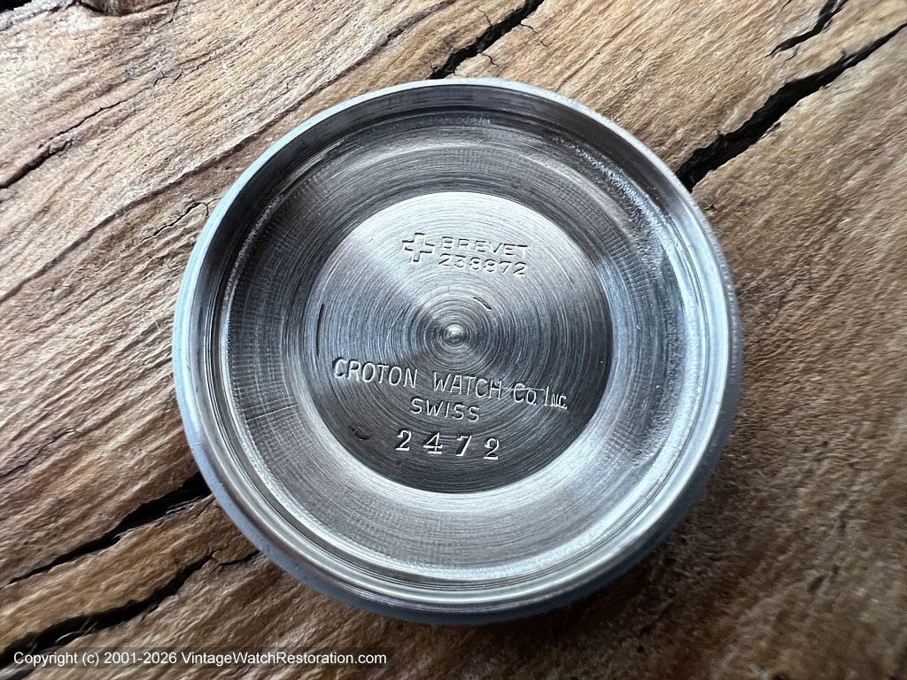Case NOS stainless steel case with screw back lid. Inside back lid signed 'Croton Watch Co. Inc., Swiss' and model 2472