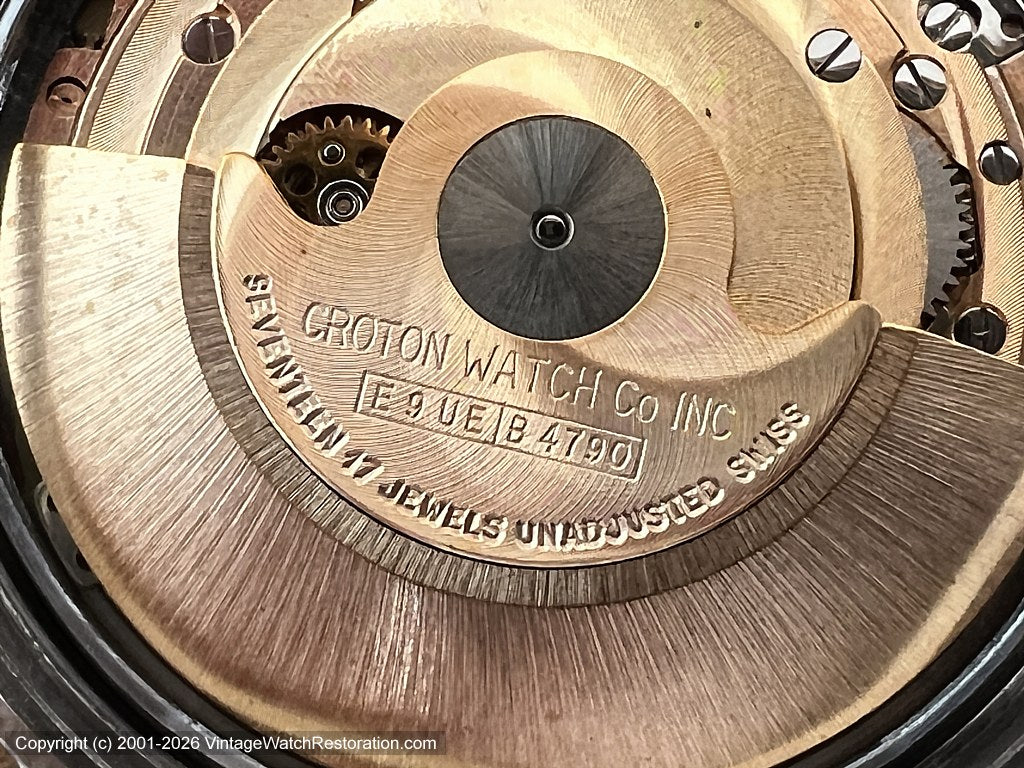Fitted with a 17 jewel Croton Watch Co. Inc. signed automatic, marked E9UE/B4790ls. with serial number 3342640. Set smoothy and keeps good time.  Provided with a 6-month mechanical warranty