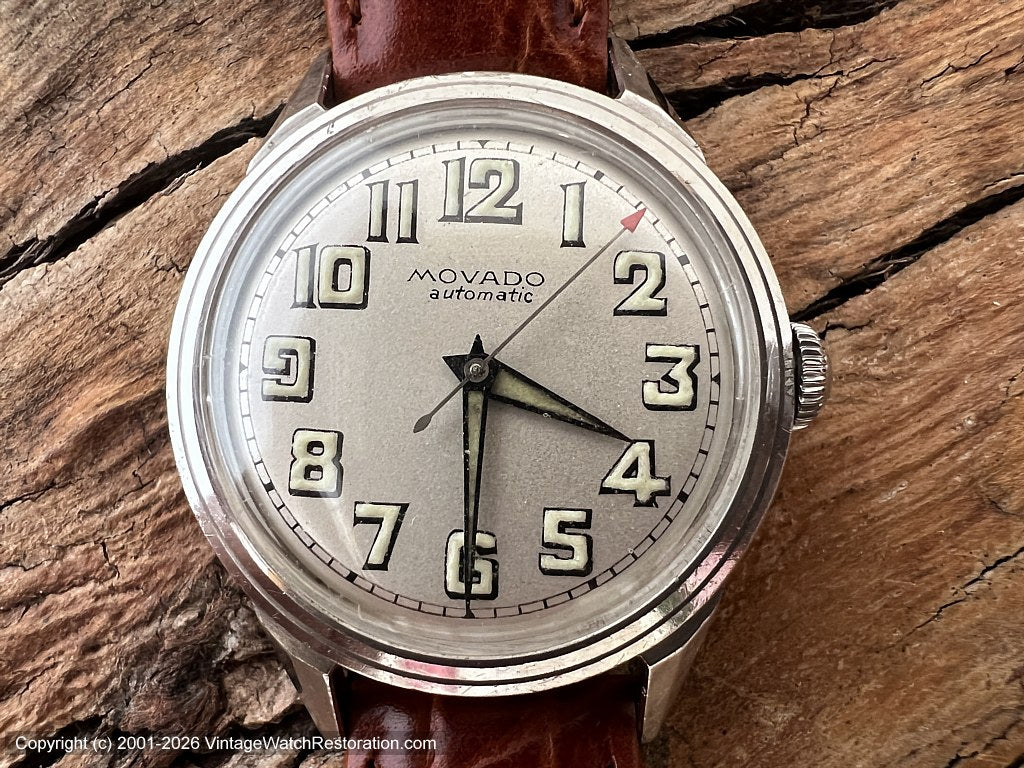 | Dial | Silver dial with large light green lumed numbers trimmed in black. Black hour and minute hands with green lume and a silver sweep second hand with red tipped arrow. Marked "Movado Automatic" in black at top. Railroad minute markers around outer edge. |