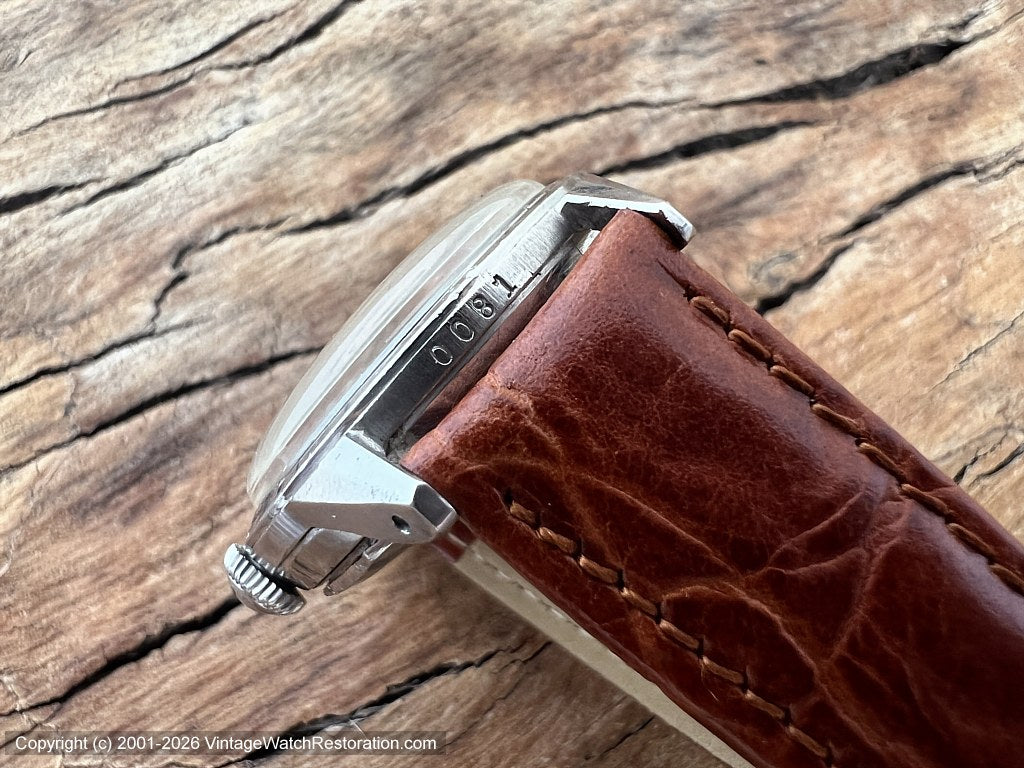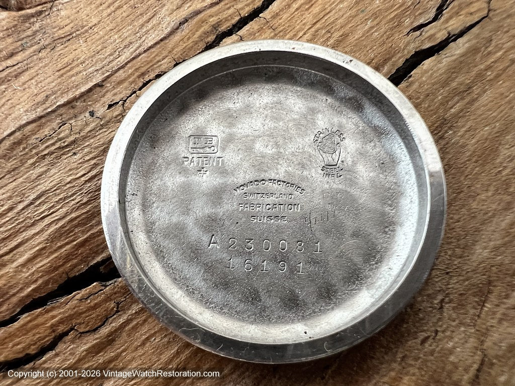 | Case | Stainless steel case with bold lugs and screw down back lid. Inside lid has the Movado "hand holding watch" logo signed Movado Factories, serial A230082/16191, and Fabrication Suisse |