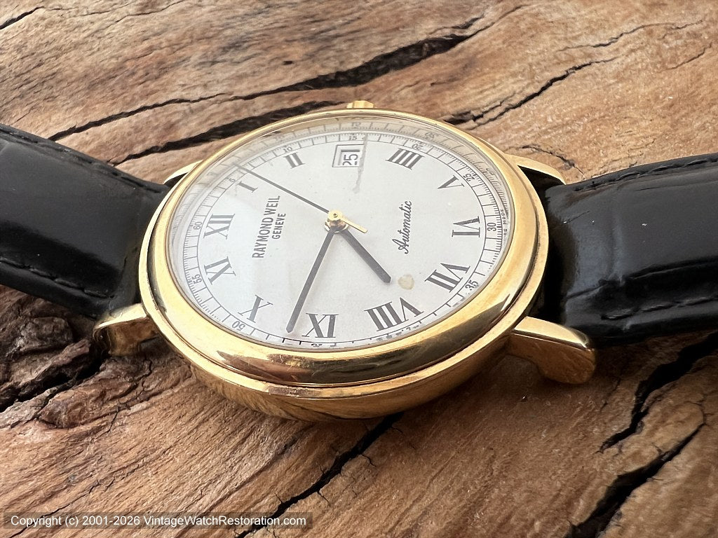 Dial Perfect snow white dial with black Roman numerals and minute/second railroad tick markers around outer edge. Signed Raymond Weil in black at top and "Automatic" in black script at bottom. Steel black hour and minute hands and two-tone gold and black sweep second hand. Date aperture window at 3 o'clock which has a quick-set feature by pulling crown out to first position.