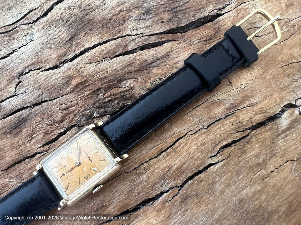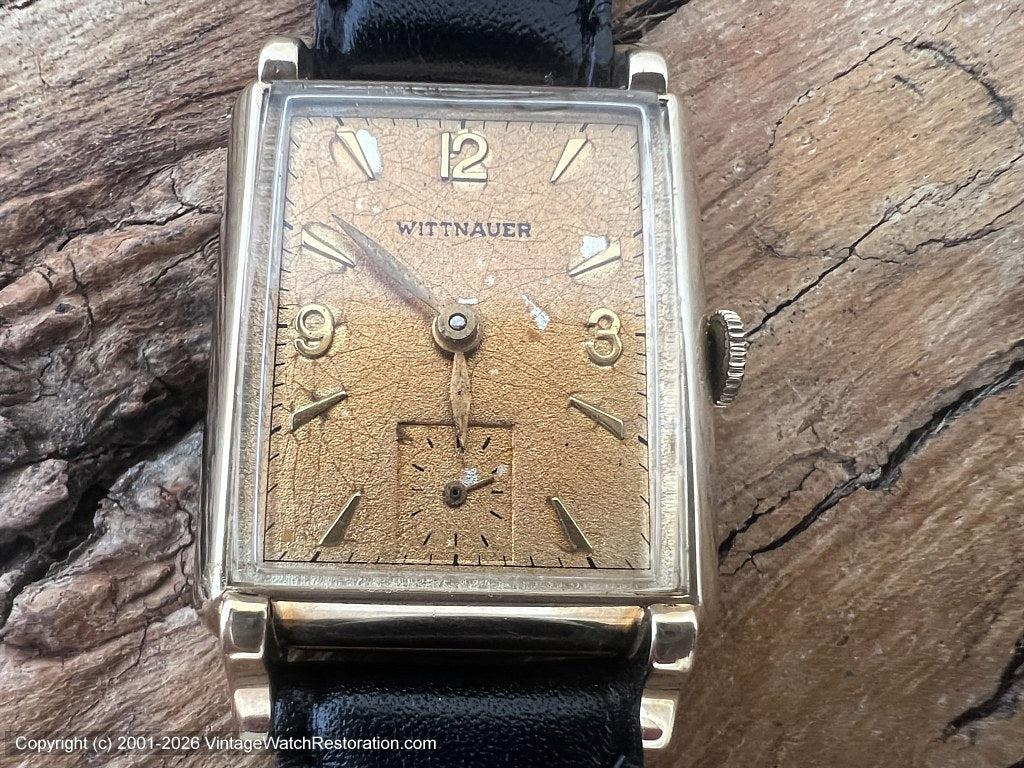 Golden-orange patina dial with minor flecks and raised yellow gold numbers at main axes and bar markers in between. Signed Wittnauer in black at top and a rectangular second sub dial at bottom. Dauphine-style golden hour and minute hands
