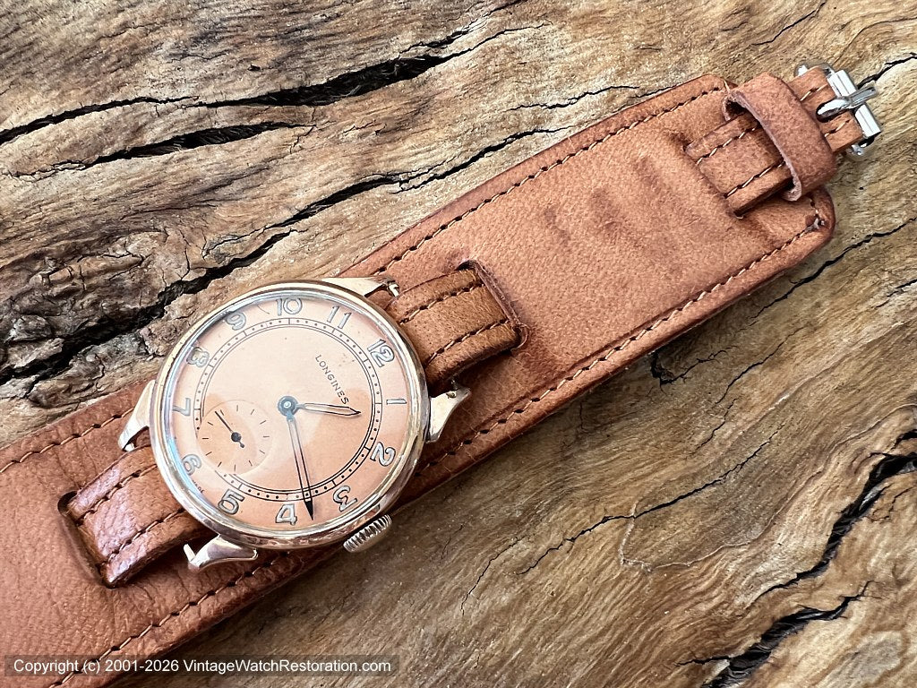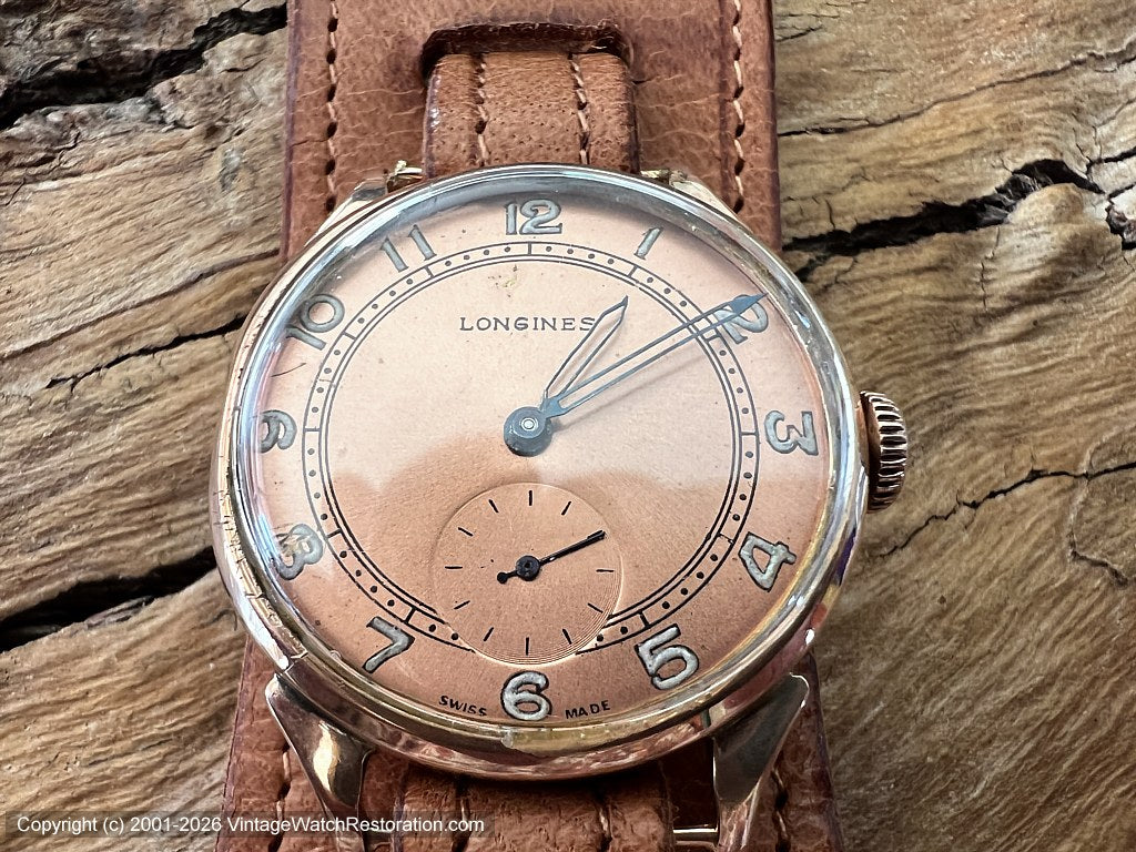 Refinished dial in copper with black inner ring with minute markers with Longines in black at top. Large light yellow lume numbers. Blue steel hour and minute hands devoid of their lume and a slightly sunken second sub dial at bottom. |