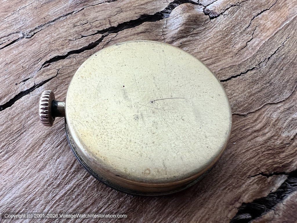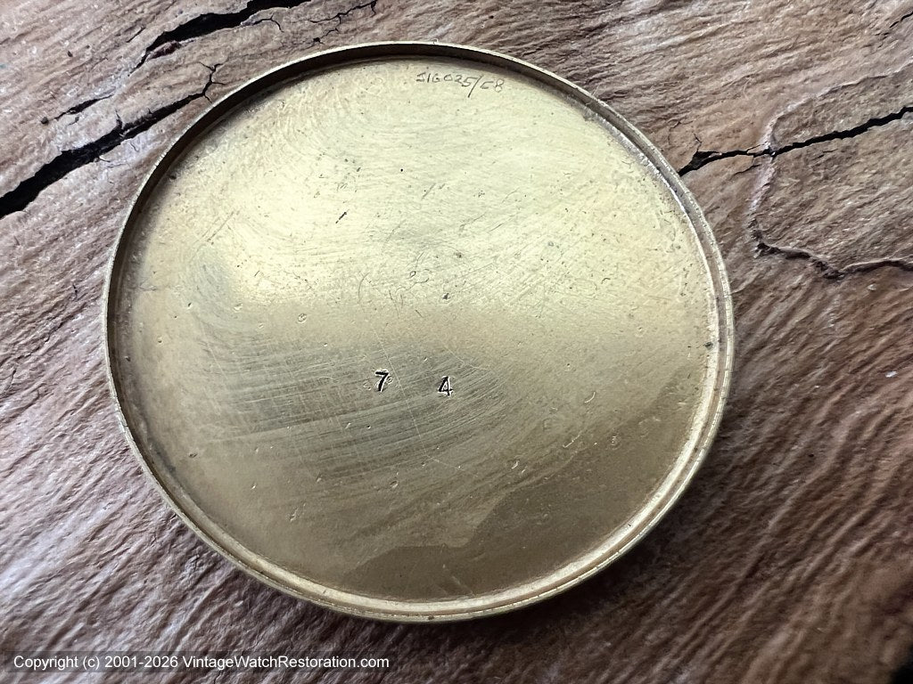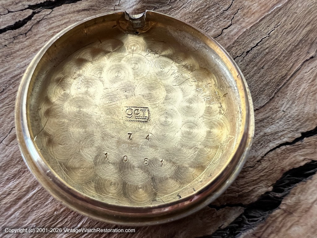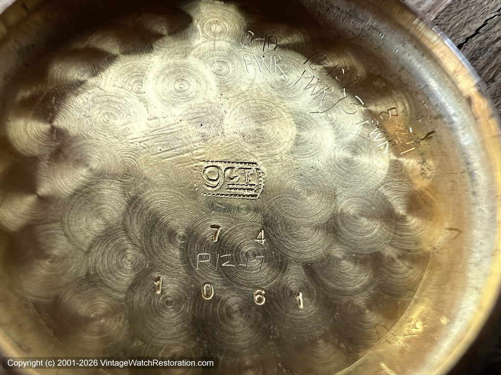 Round 9K gold case with large fixed style lugs (i.e. no lug bars). Inside lid marked 9CT (for 9K gold) and 74/1061. Movement doubly protected with an inner case lid as well. |