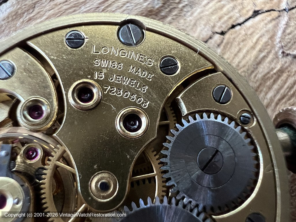 Fitted with a 15-jewel Longines signed manual wind movement with serial 7230503. Serviced by us, running beautifully and provided with a 12-month mechanical warranty. |