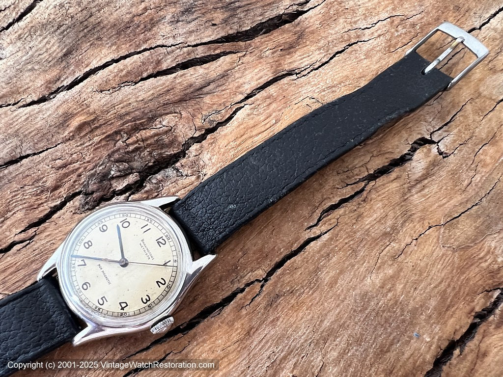 Original military style creamy dial with a black minute/second outer ring in super fine font.  Marked 'Bravingtons' at top with 'Wetrista' below, in black.  Classic looking applied Arabic numbers with steel blue hour and minute hands, and a gold sweep second hand with a spade end.