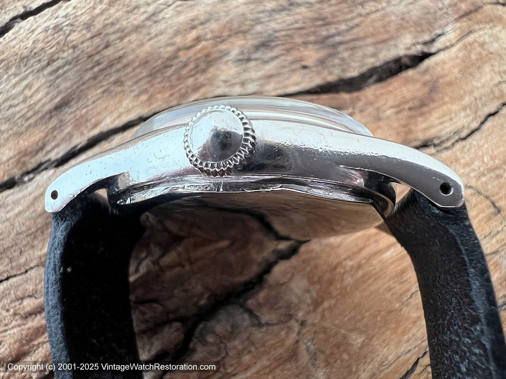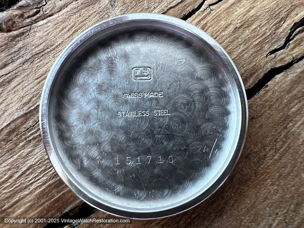 Case Chrome case with integrated lugs with a screw down stainless steel lid.  Inside lid marked Swiss Made with a logo of "FB with a key below" and serial 151710.  The logo indicates case was made by François Borgel, which later became Taubert & Fils.  Also has an inner case lid to better protect the movement.