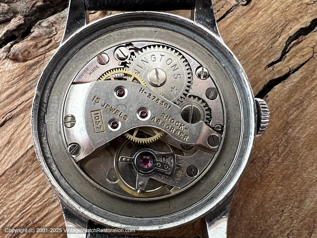 15 jewel manual wind shock absorber movement signed Bravingtons, Cal 1057 and serial H-278361. It has been recently serviced by us and comes with a 12-month mechanical warranty.