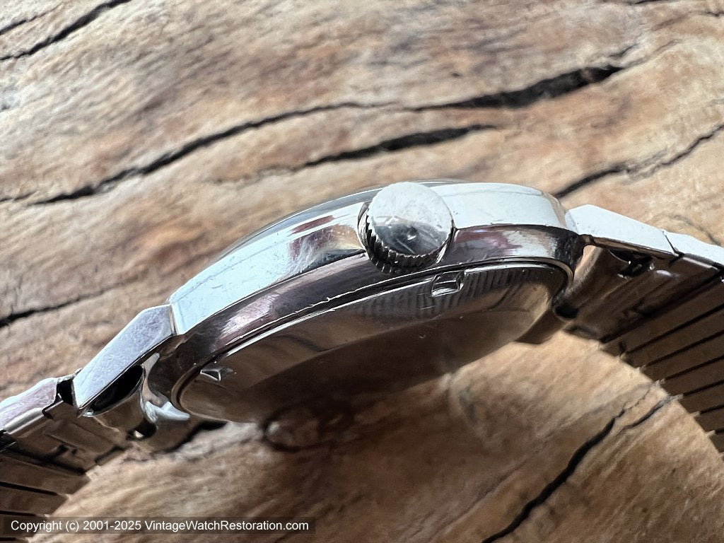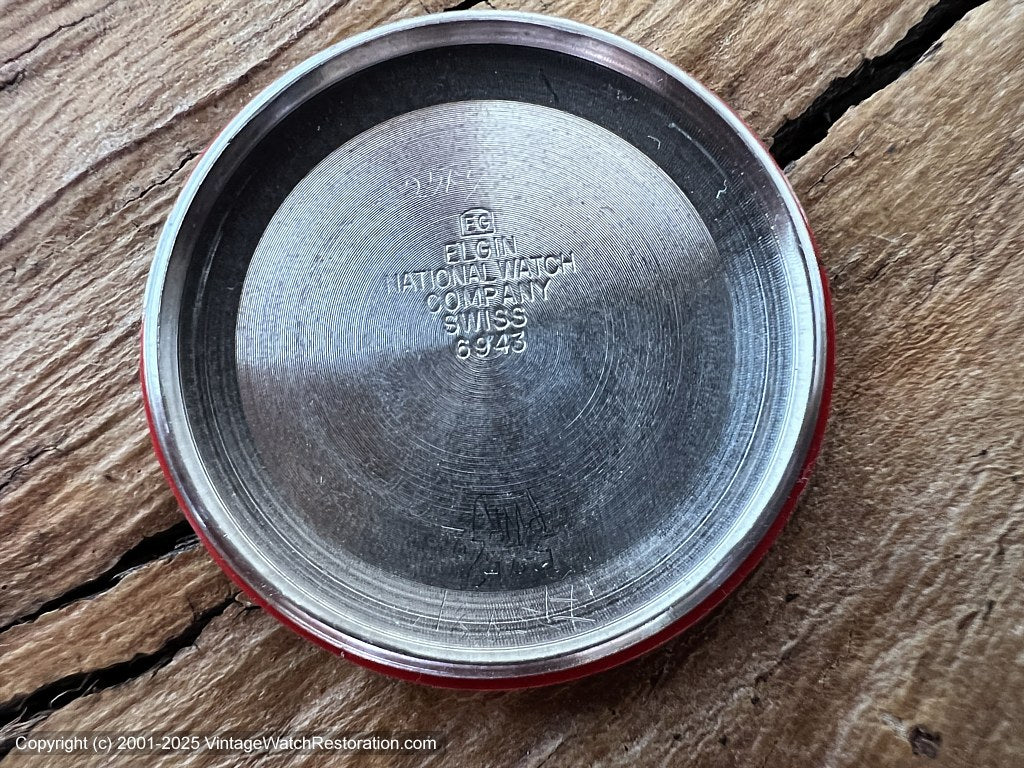 Chrome case with wide bezel and a stainless steel screw down back lid.  Signed Elgin Stainless Steel, Waterproof.  Inside back lid signed Elgin National Watch Company, Swiss, 6943