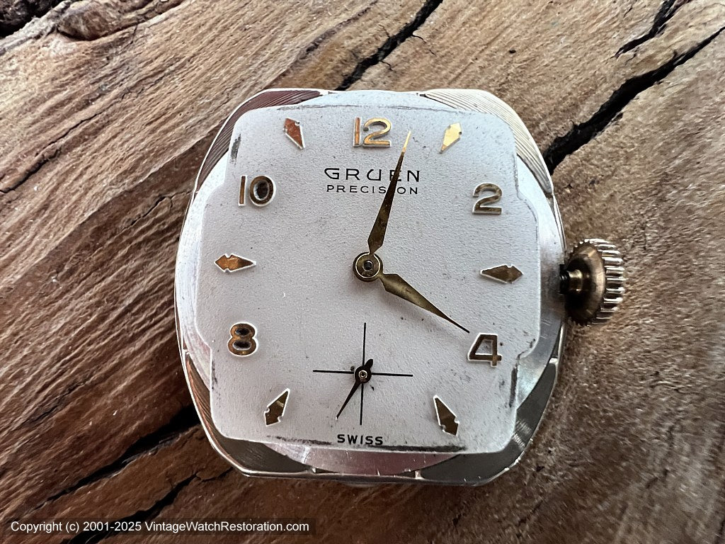 Original ivory white dial signed "Gruen Precision" at top with gold numbers alternating with teardrop markers.  Cross hair second sub dial at bottom.  Gold Dauphine style hour and minute hands.