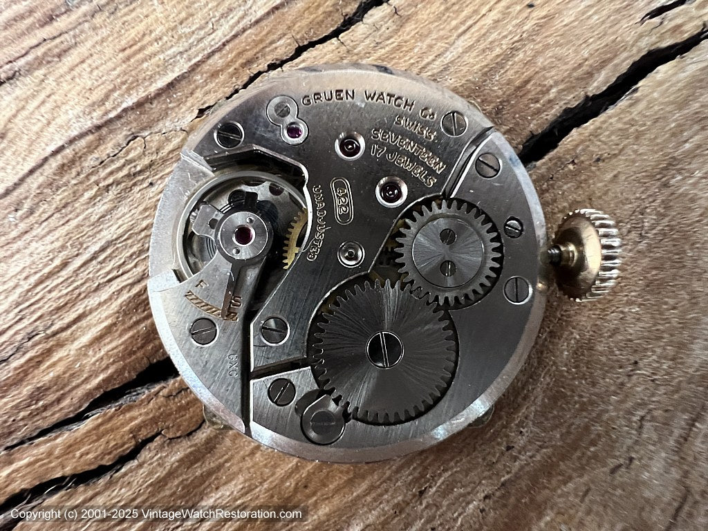 17 jewel Gruen Cal 422 manual wind movement recently serviced by us and comes with a 12-month mechanical warranty.
