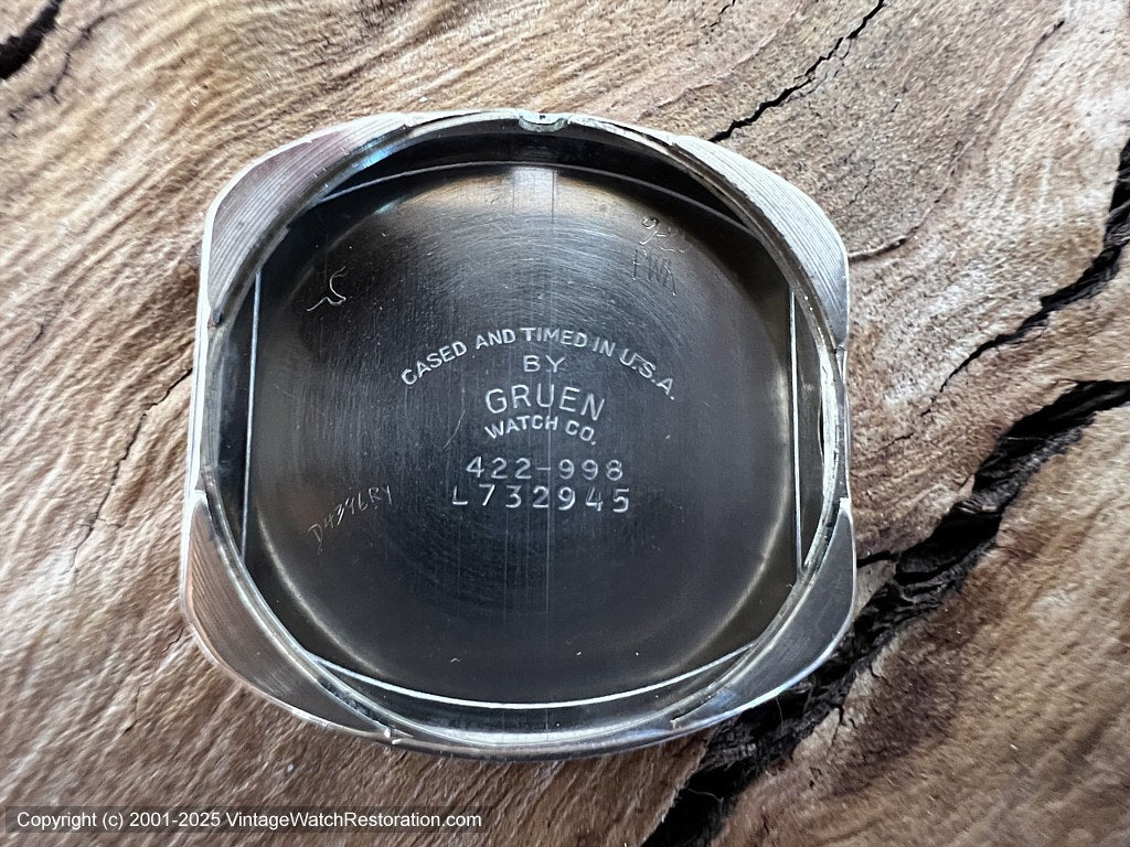 Case 10K Rolled Gold Plated case in a way-cool 4-leaf Clover shape and horned lugs.  Stainless steel back.  Inside case signed Gruen Watch Company, Model 422-998 and serial L732945