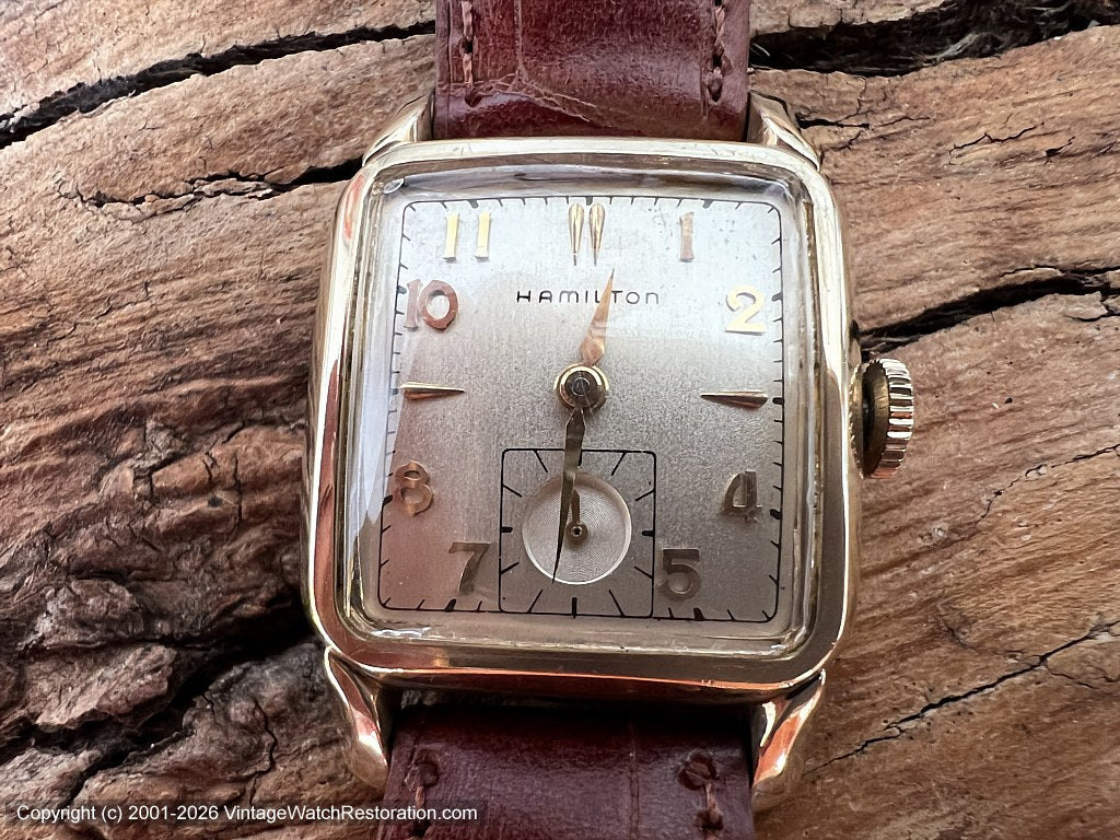 Beautifully refinished dial in champagne color with raised gold numbers except at main axes where they are dagger markers instead.  Gold hour and minute hands and small sunken second sub dial at bottom.  Signed Hamilton in black at top side. Minute black tick markers around outer edge of dial.