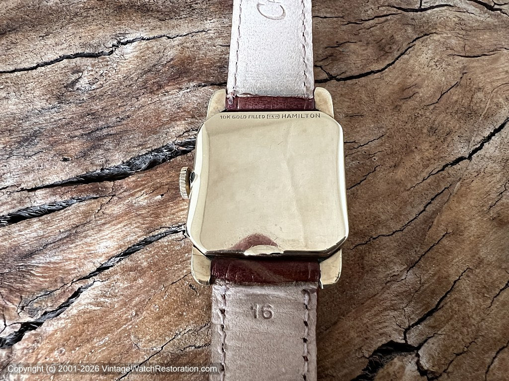 Case Square case with rounded corners and beveled teardrop lugs.  The 10K gold filled case by S&W is near perfect condition. Inside of case signed Hamilton W.Co., Lancaster, PA, S&W as the case manufacturer and the model name "Fulton" and serial S558843