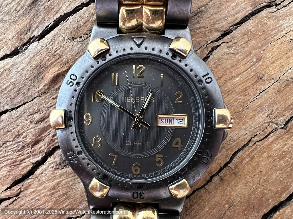Helbros NOS Day-Date Chunky Gold and Gray Bezel and Bracelet, Quartz, 38mm