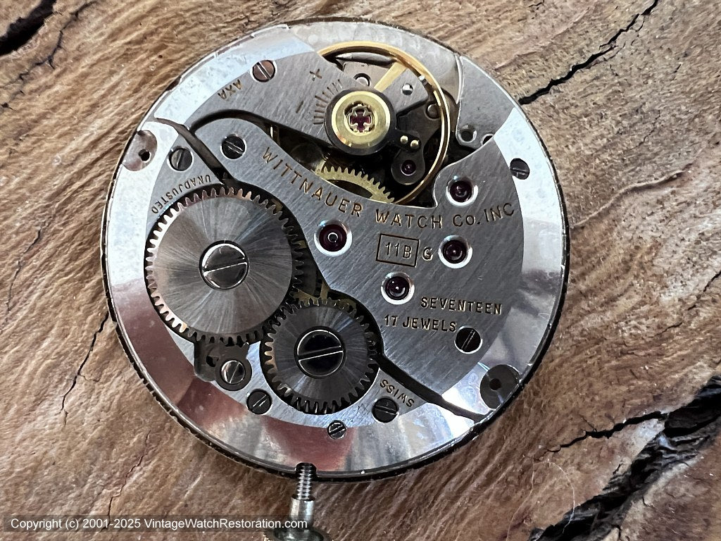 17 jewel Wittnauer Watch Co. Cal 11B manual wind movement recently serviced by us and comes with a 12-month mechanical warranty