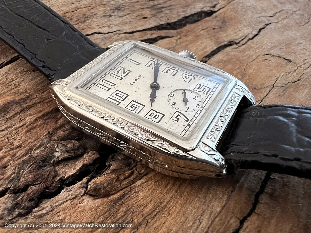 Decorative square 14K white gold filled square cut case with decorative elements all along the bezel top and along sides of case. Case back is slightly curved. Inside lid marked "Cased and Timed by Elgin National Watch Co." and "Star Case Company, 14KT Gold Filled, Model E9" underneath. Serial 8039893 |