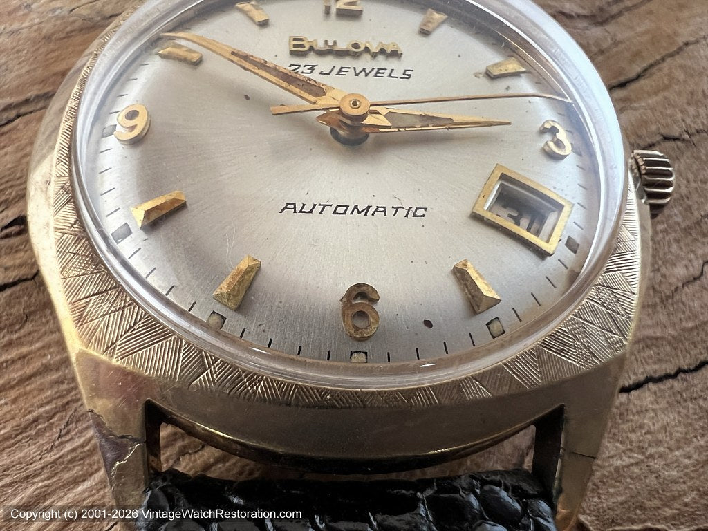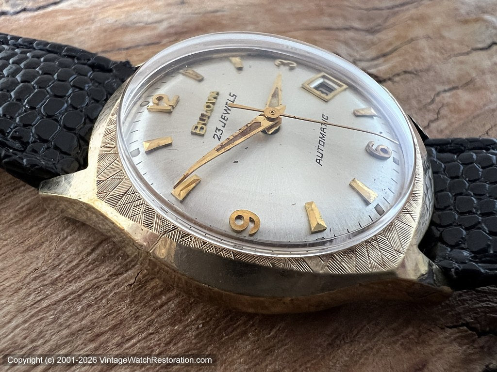 Bulova 23 Jewel Pearl White Dial in Stunning Gold Textured Bezel Case with Date, Automatic, 32.5x38mm