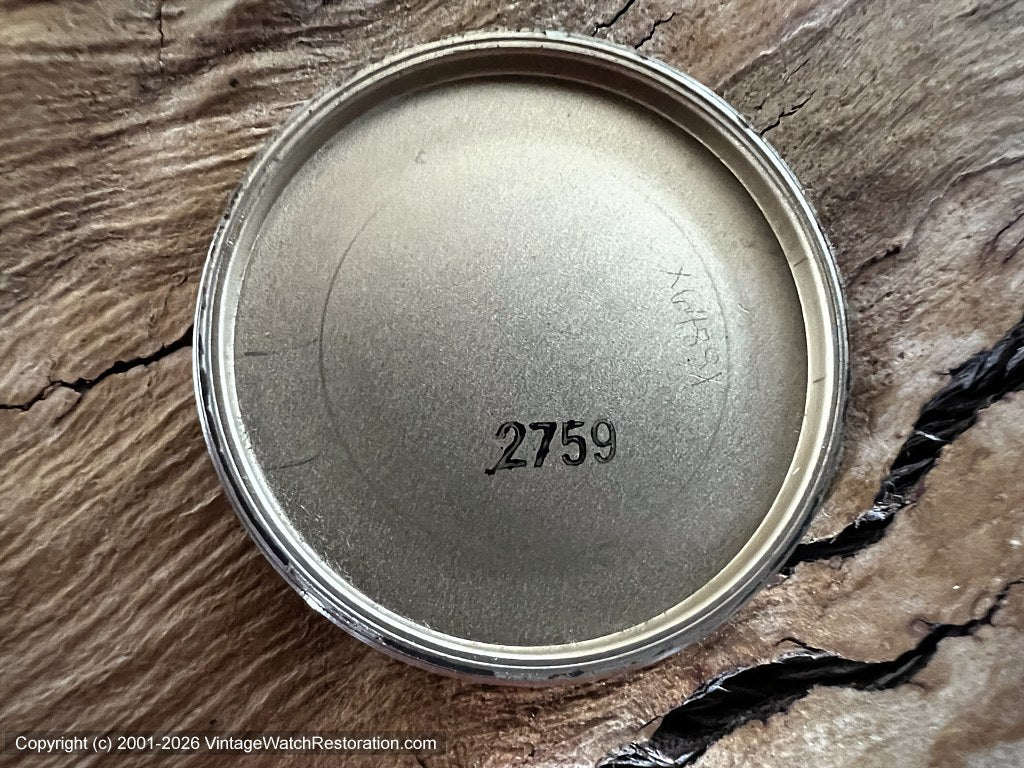 Case Heavy gold electroplated bezel and 10K Rolled Gold plate back with a screw holddown ring. Serial number J404096 and date code N2 for 1972.  Plating wear/nick on the bottom lugs as shown in pictures.