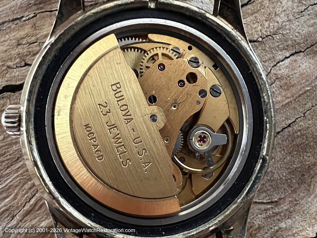 Fitted with a 23 jewel Bulova Cal 10CPACD automatic Swiss movement that is running perfectly and keeping great time and offered with a 6-month mechanical warranty.