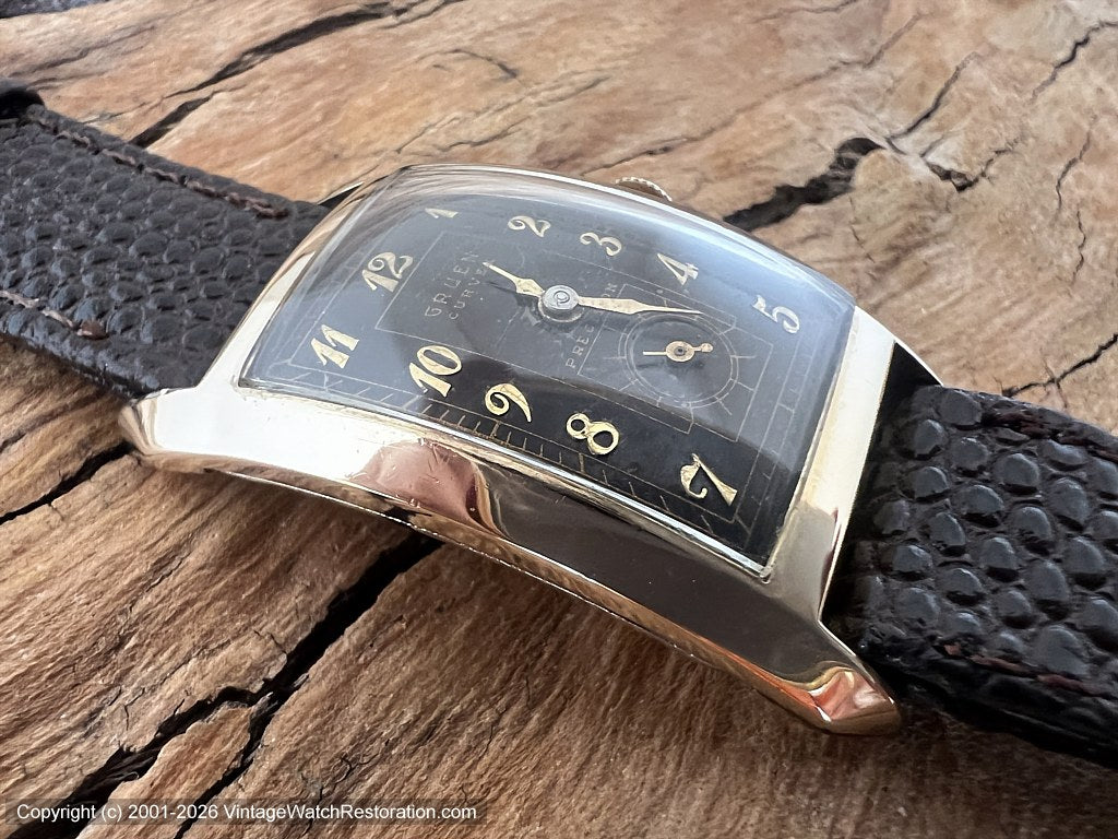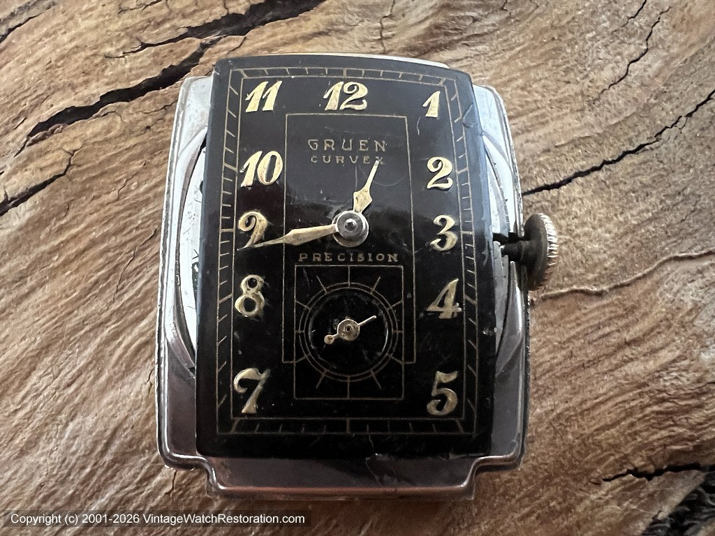 Black dial (early refinish I believe) with Gruen Curvex at top in gold lettering and "Precision" above second sub dial at bottom. Gold railroad track minute markers around outer edge. Gold hour and minute hands.