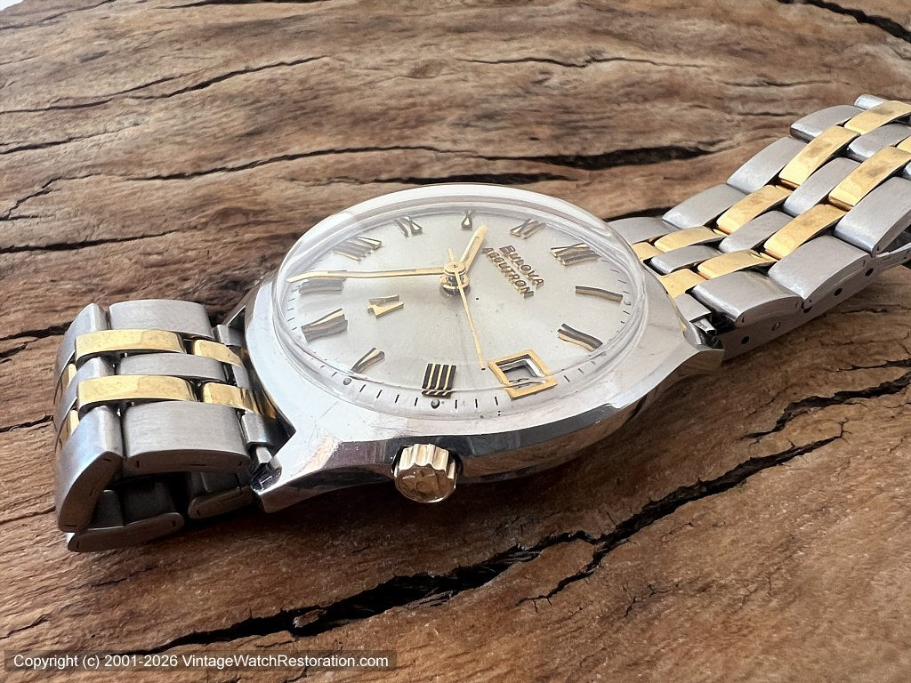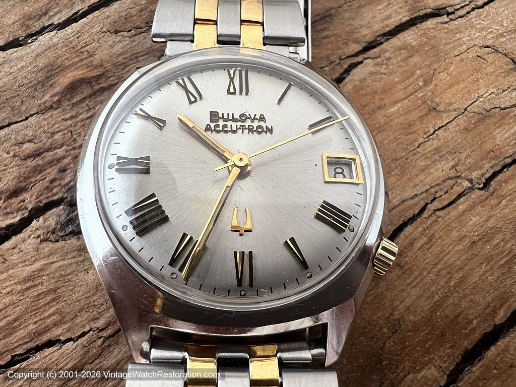 Spotless silver dial with gold & black Roman numerals, Bulova Accutron marked at top, also in gold & black, with the gold Accutron tuning fork logo at bottom. Squared off gold hour and minute hands with a thin black inset line and gold sweep second hand. Date aperture window at 3 o'clock, trimmed in gold. |