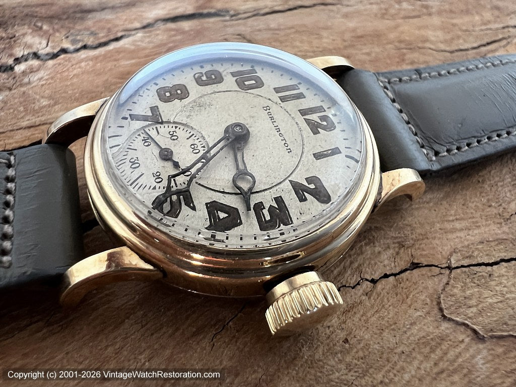 Original parchment dial that defies its 100+ year age.  Large dark lume applied numbers with black minute tick markers around outer edge. On inside ring, signed Burlington at top and a large second sub dial at bottom of dial. Hour and minute hands have lost their lume